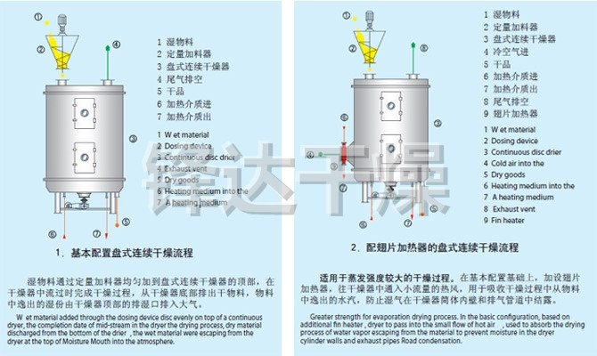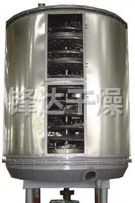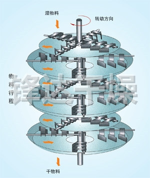 湿物料自加料器连续地加到干燥器上部第一层干燥盘上,带有耙叶的耙臂作回转运动使耙臂作回转运动使耙叶连续地翻抄物料。物料沿指数螺旋线流过干燥盘表面,在小干燥盘上的物料被移送到外缘,并在外缘落到下方的大干燥盘外缘,在大干盘上物料向里移动并从中间落料口落如下一层小干燥盘中。大小干燥盘上下交替排列,物料得以连续地流过整个干燥器。中空的干燥盘内通入加热介质,加热介质形式有饱和蒸汽、热水和导热油,加热介质由干燥盘的一端进入,从另一端导出。已干物料从最后一层干燥盘落到壳体的底层,最后被耙叶移送到出料口排出。湿份从物料中逸出,由设在顶盖上的排湿口排出,真空型盘式干燥器的湿气由设在顶盖上的真空泵口排出。从底层排出的干物料可直接包装。通过配加翅片加热器、溶剂回收冷凝器、袋式除尘器、干料返混机构、引风机等辅机,可提高其干燥的生产能力,干燥膏糊状和热敏性物 料,可方便地回收溶剂,并能进行热解和反应操作。